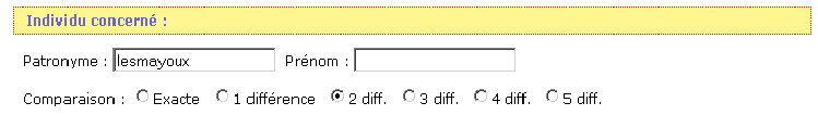 Si vous ne trouvez pas votre bonheur modifiez ou les différences ou les critères de date. Mais progressivement, et en fonction des noms que vous recherchez ! (Si vous cherchez avec 5 différences sur un nom de 5 lettres dans une base assez conséquente vous allez récupérer des milliers de noms inutiles)